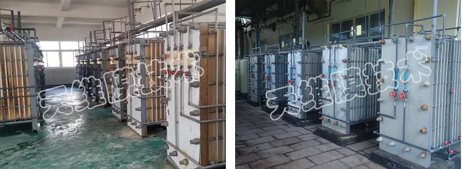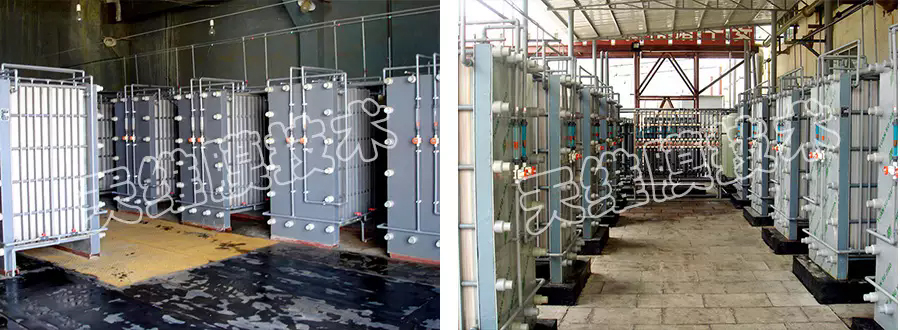 化成箔生产的腐蚀工段会产生硫酸/硫酸铝、硝酸/硝酸铝废水,采用扩散渗析装置可将废酸中的硫酸、硝酸进行有效回用,代替传统的中和处理法,大幅度降低了残渣量和含盐量,酸回收率>80%,金属离子截留率>90%。目前,扩散渗析酸回收技术在化成箔行业废酸处理中覆盖率已达85%以上。