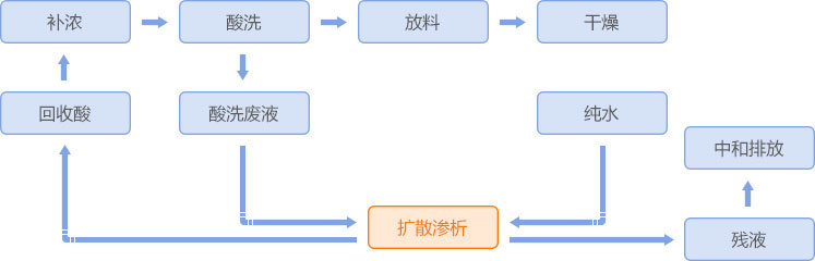 针对石墨行业含混酸(盐酸、硝酸、氢氟酸)的特殊组分,采用山东天维膜技术有限公司扩散渗析器装置将混酸进行提纯分离,酸回收率达到80%以上,回收液按照比例补浓后继续返回石墨生产工艺使用,既解决了高浓度混酸排放问题,又实现了混酸的有效回用。