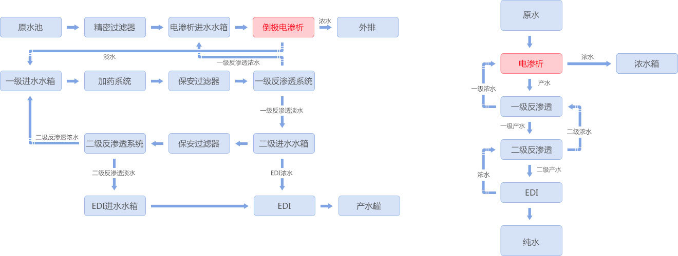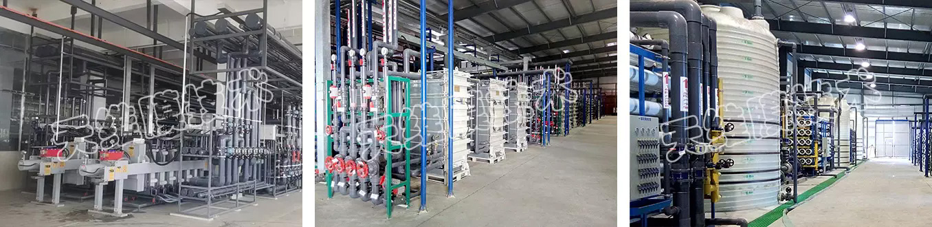 热电厂反渗透浓水经电渗析处理到锅炉用水标准。反渗透浓水电导率3700μS/cm,水量150m³/h,经电渗析处理后,电渗析浓水出水26m³/h,含盐量11118mg/L。进一步,电渗析淡水进入反渗透系统,反渗透淡水进一步经EDI处理为锅炉用水,EDI产水电导率≤0.2μS/cm,pH值7±1。