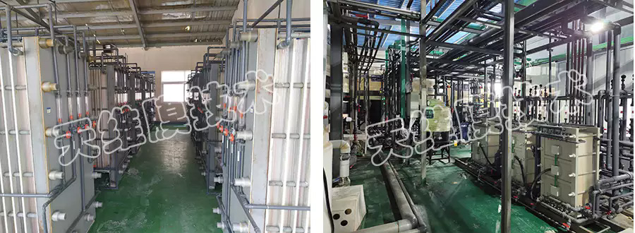电镀废水由于其水质复杂,各类重金属、COD含量较高,一直是膜浓缩工艺中的难点,采用均相膜电渗析装置有效的解决了此问题,原水经沉降、氧化、超滤预处理后进入电渗析浓缩, 达到12%后进入MVR蒸发,淡水经反渗透处理后回用,电镀废水得到有效处理,达到近零排放。